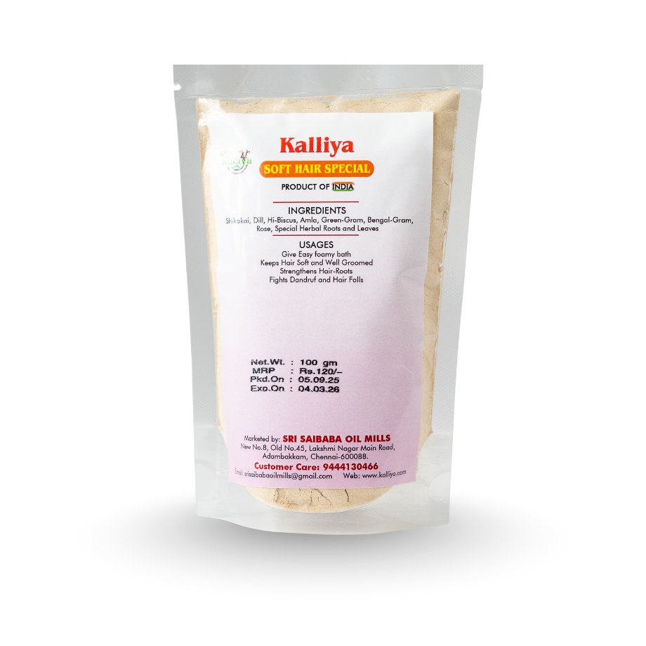 Nourish your hair with Kalliya Natural Soft Hair Special, a unique blend of Sikakkai Powder with Foam. This herbal formula gently cleanses, leaving hair soft and manageable, while the luxurious lather enhances the washing experience. Embrace traditional wisdom in a modern, chemical-free hair care routine.